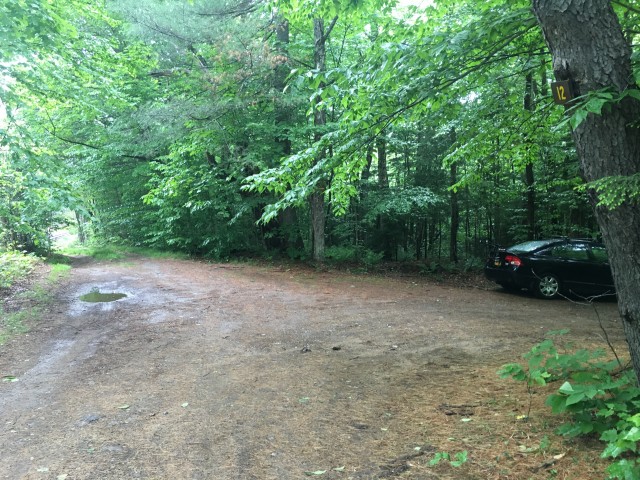 When I came to Route 30, the brochure said to bike .1 miles before getting to the woods road to Sunday Pond, but where I emerged from the Rat Pond area was pretty much directly across the road from it. Look for this little gap in the trees: