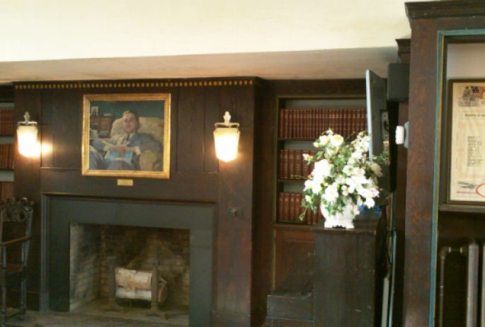 Some of the volumes from the original working medical library are still in residence there, along with Mr. Black's portrait over the fireplace. The John Black Room is now used for lectures, study, and exhibits. Currently, the displays are about The Great War and Saranac Lake.
