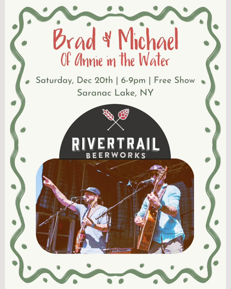 Looking for Saturday plans? We’ve got you covered. Enjoy live music with Brad and Mike from Annie in the Water from