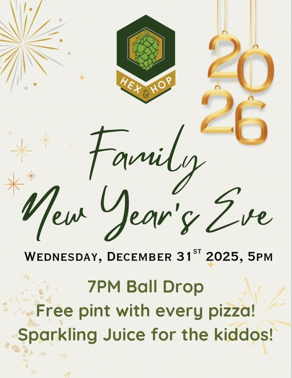 Join us at Hex & Hop for our second annual, family-friendly New Year’s Eve celebration! We’ll count down to the New Year with an early 7:00 PM ball drop—perfect for families who want to celebrate and still make it home before bedtime. Sparkling cider will be on hand for kids to join in the toast, and adults can enjoy a free pint with every pizza. Our full kitchen menu and draft list will be available throughout the evening.