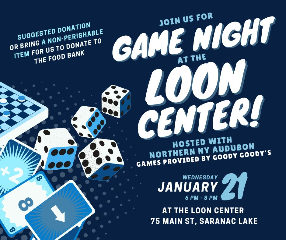Join us for the first of our winter events with Game Night at the Loon Center, hosted in partnership with Northern NY Audubon and featuring games provided by Goody Goody’s.