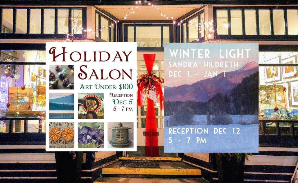 Art Under $100 is a special display of unique gift items created by members of the Adirondack Artists Guild. The regular displays of member work will also still be available and the featured artist for December is Sandra Hildreth. Her exhibit, "Winter Light", will have an opening reception on Dec 12, from 5-7. The Holiday Salon will be on display the entire month. In the tradition of the holidays, cookies, hot chocolate and other treats will be provided at the Dec 5 reception, from 5 - 7 pm. It's a busy evening in town with Sparkle Village and Santa arriving - we hope you'll find time to stop in the gallery as well.