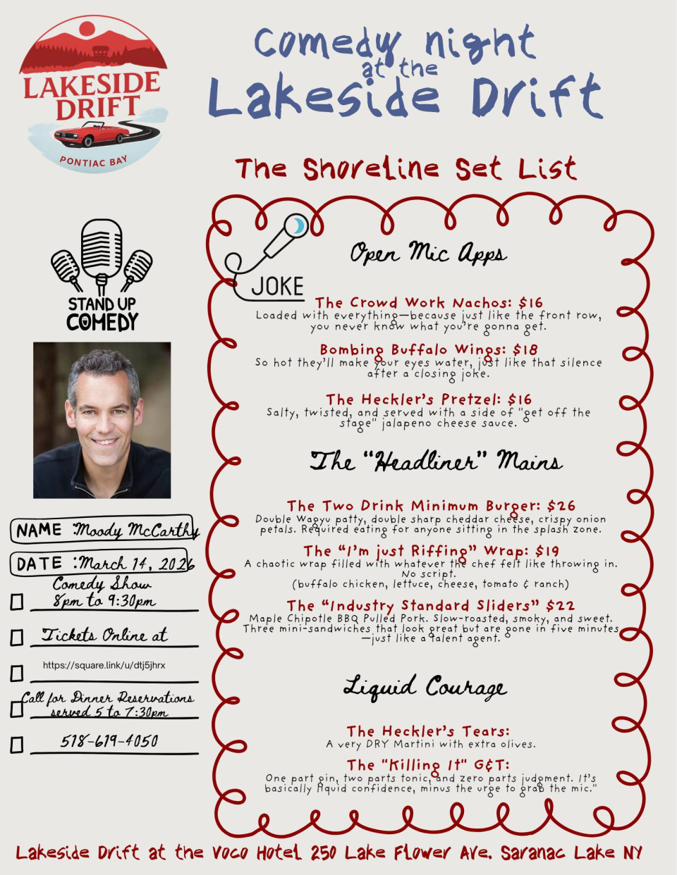 We are bringing the laughs on Saturday 3/14/26 with Moody McCarthy headlining the show! We will also have a special dinner menu that night. Check out the menu below, and purchase your tickets at the link to reserve your spot!