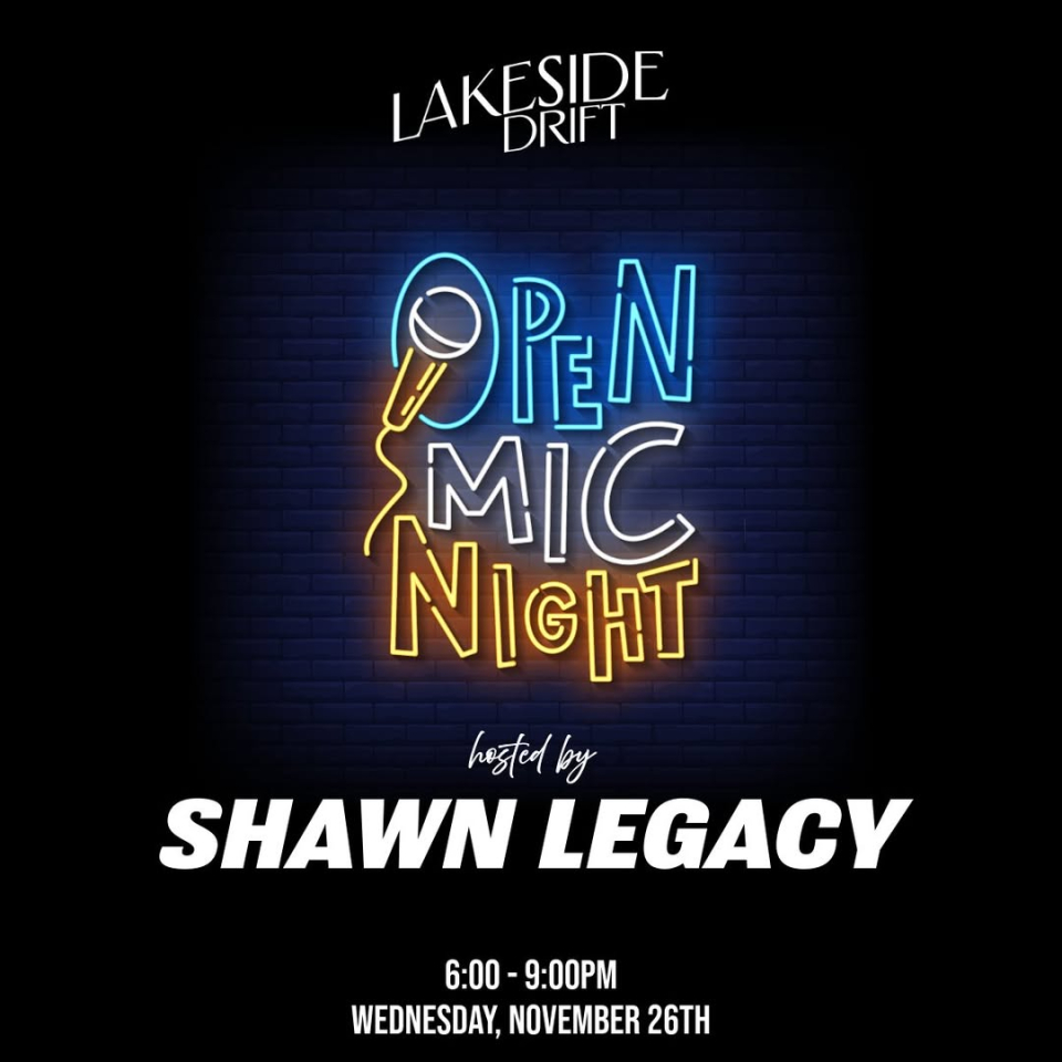 Looking for Thanksgiving Eve plans? Lakeside Drift is hosting an Open Mic Night with Shawn Legacy from 6–9 PM. Come share your talents or relax and enjoy an evening of local performances!