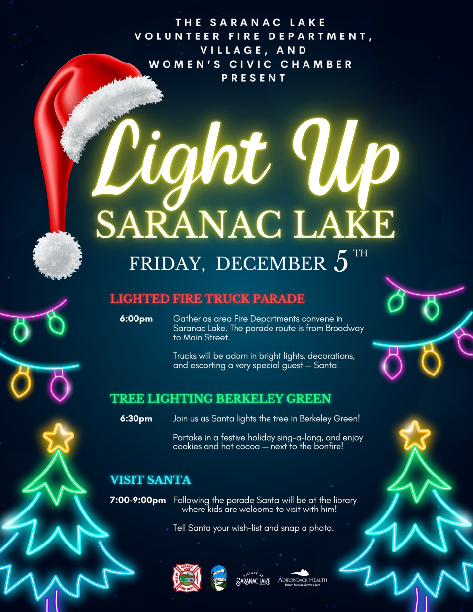 The Village of Saranac Lake is thrilled to announce the return of our annual Light Up Saranac Lake celebration on Friday, December 5th! This family-friendly event will feature a spectacular Lighted Fire Truck Parade, a festive tree lighting, and of course, a special visit from Santa himself.