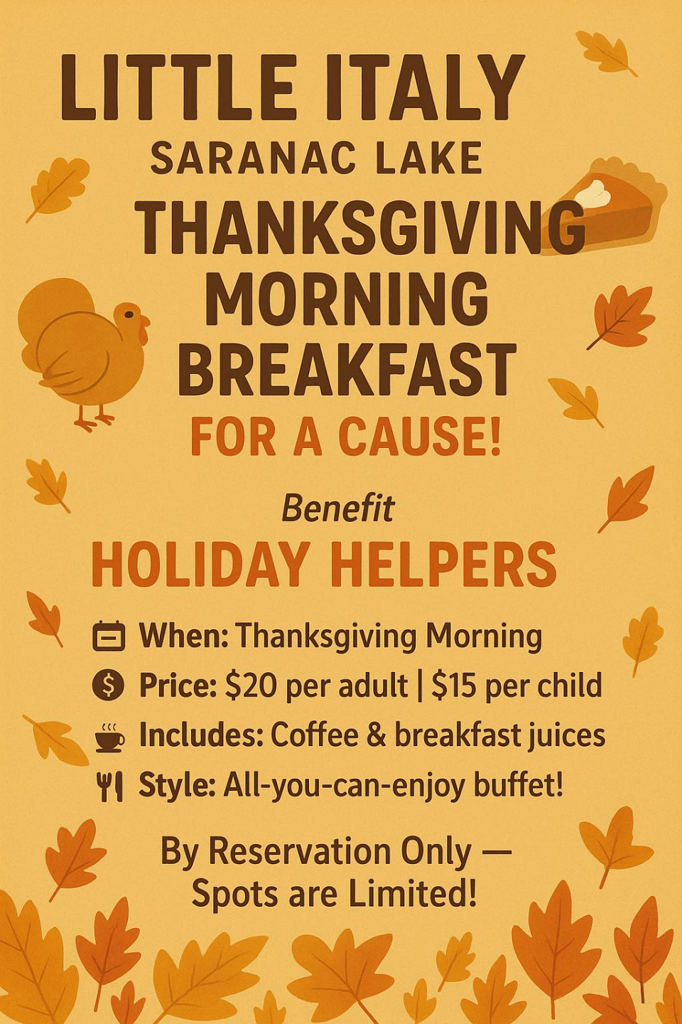 We’re hosting a Thanksgiving Morning Breakfast Buffet to benefit Holiday Helpers, supporting families in need this season.
