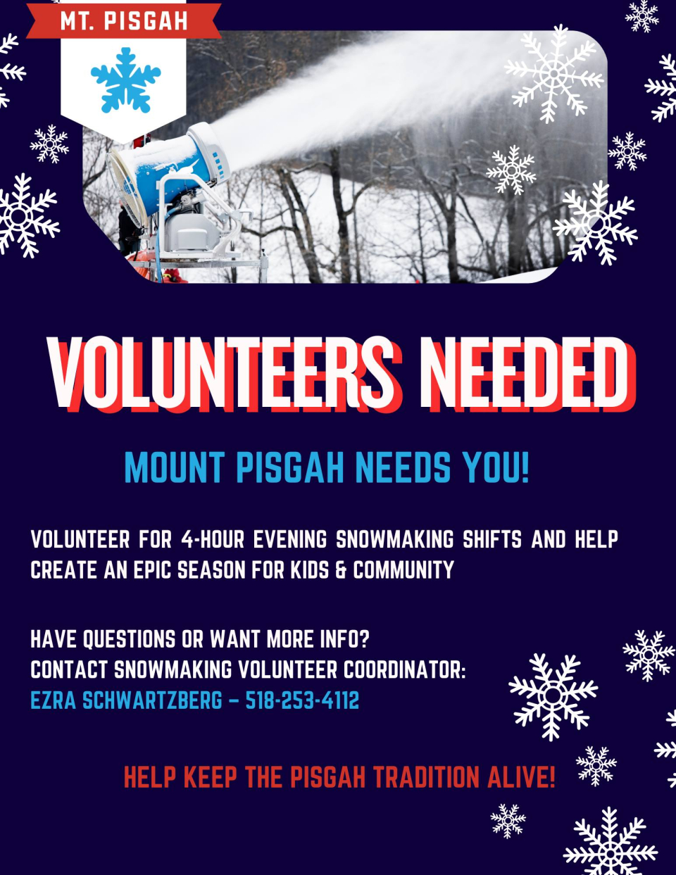 Mount Pisgah is looking for community volunteers to help with evening snowmaking. Volunteers are needed for 4-hour evening shifts to help get the mountain ready for the season and support winter recreation for kids and the community.
