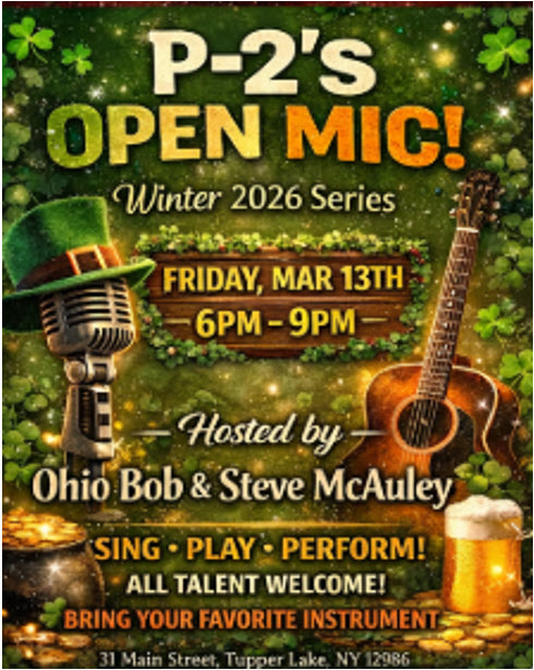 Looking for a night of authentic Tupper Lake entertainment? Head over to P-2's Irish Pub for their Open MIC Night, hosted by the dynamic duo, Ohio Bob and Steve McAuley! Whether you're a seasoned performer or just love to strum a few chords, this is your chance to shine.