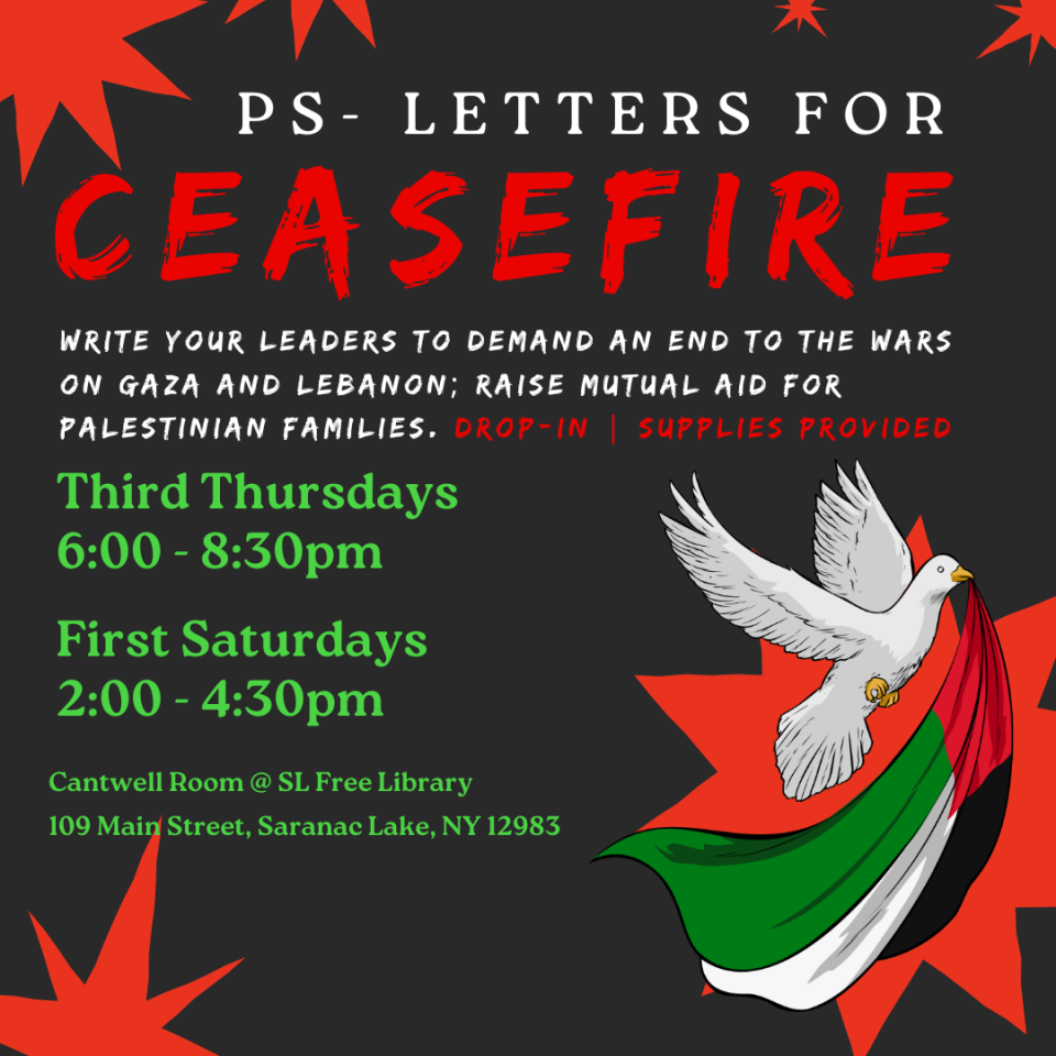 Join us to write postcards to our elected officials demanding an immediate and permanent ceasefire in Gaza. We provide all mailing supplies, writing prompts, and resources for contacting local, state, and national representatives. Third Thursdays (6-8:30pm) and First Saturdays (2-4:30pm) at the Saranac Lake Free Library, Cantwell Room. Drop in and help us foster Palestinian solidarity here in the Adirondacks. All are welcome. MERV-13 level air filtration; all gender restrooms; masks provided.