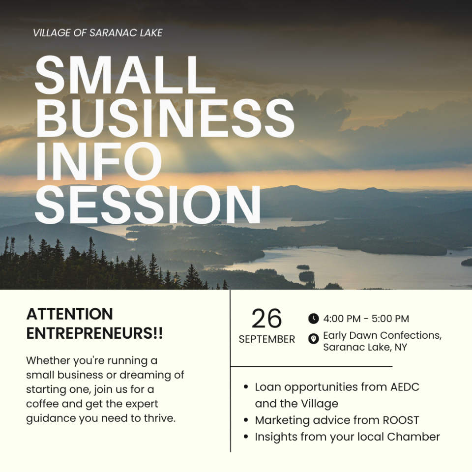 Are you an entrepreneur or small business owner looking to expand or start your business in Saranac Lake? Join us for an informative session hosted by the Saranac Lake Village, where you'll have the opportunity to learn about loan offers and financing options available from Saranac Lake Village and the Adirondack Economic Development Taskforce (AEDT).