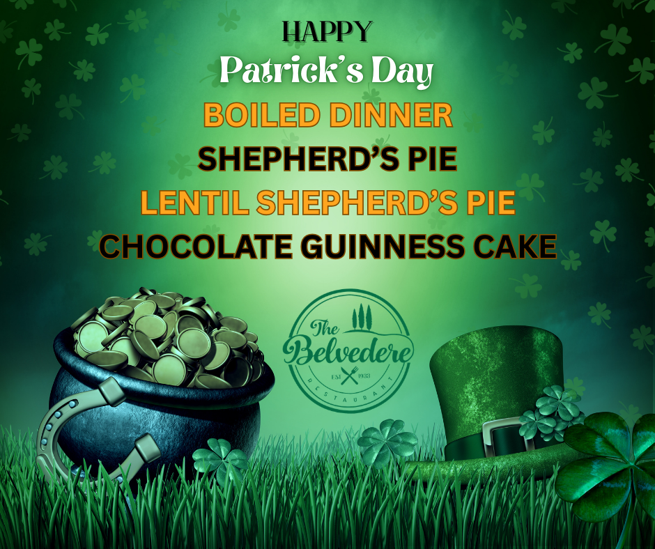 Celebrate St. Patrick’s Day with festive favorites and a little luck of the Irish at The Belvedere Restaurant. Join us for classic comfort dishes and a sweet treat to finish the meal.