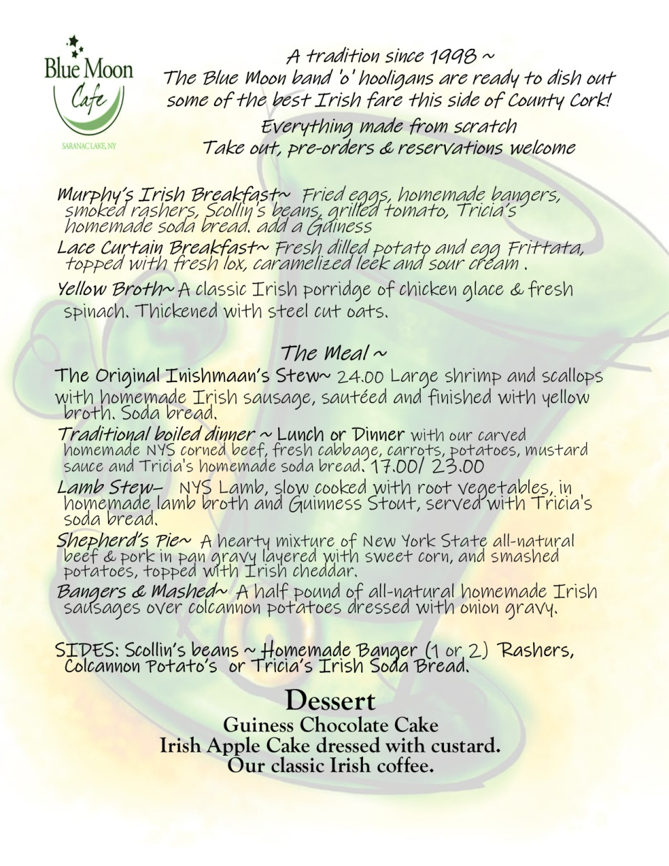 Blue Moon Café is serving up festive dining options for breakfast, lunch, and dinner all weekend long, leading up to St. Patrick’s Day! Enjoy a traditional boiled dinner and other holiday favorites, available for dine-in, takeout, and pre-order. The celebration continues until 7 PM on St. Patrick’s Day. A local tradition since 1998!