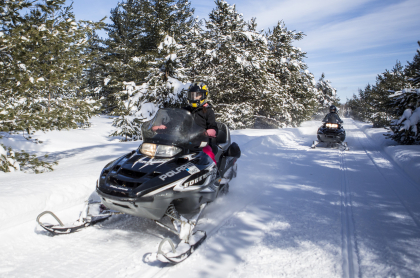 Two participants in winter sports race over snow in the Empire State Winter Games. One athlete is in a blue shirt and snowshoes