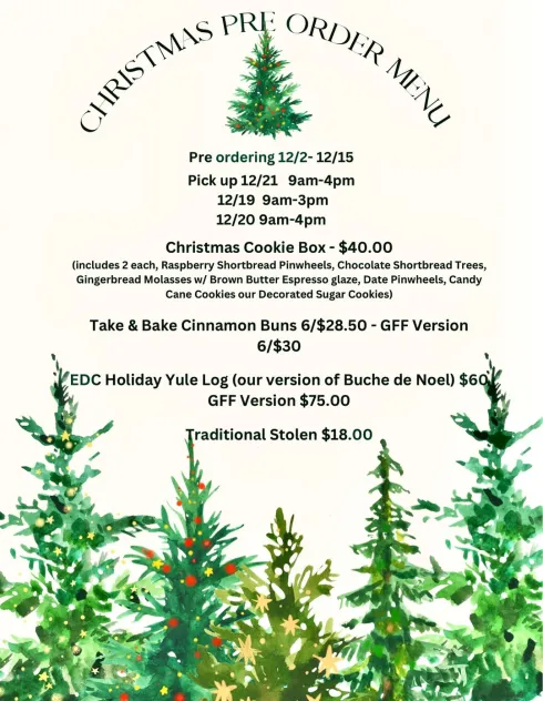 Our final café week of 2025 runs December 18–21. Pre-order pickups will be available December 19 or 20 during café hours—please note your preferred pickup date when ordering.