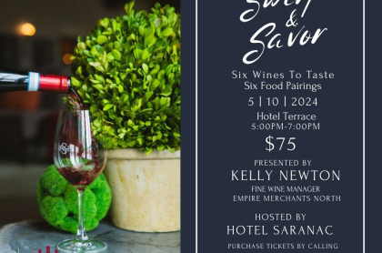 Indulge in an evening of sensory delight! Join us for Swirl & Savor: Six Wines To Taste on May 10, 2024, from 5:00 PM to 7:00 PM. Presented by Kelly Newton the Fine Wine Manager from Empire Merchants North. This exclusive event at Hotel Saranac...