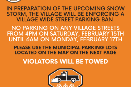 Winter Storm Parking Notice Attention Saranac Lake: Due to the anticipated winter storm, a parking ban will be in effect on ALL Village streets from Saturday, February 15 at 4 PM until Monday, February 17 at 6 AM. Please park in designated municipal...