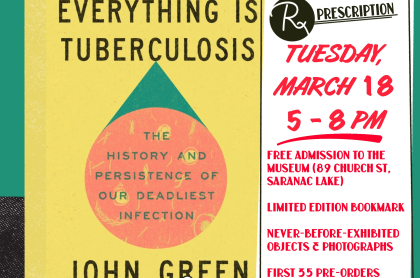Book Release Party: Everything is Tuberculosis! by John Green Date: Tuesday, March 18, 2025 Time: 5:00 PM - 8:00 PM Location: The Saranac Laboratory Museum, Saranac Lake, NY Celebrate the release of John Green's new book, Everything is Tuberculosis!...