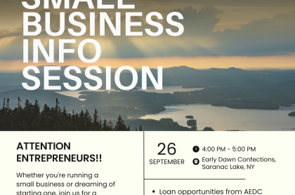 Small Business Information Session Date: Thursday, September 26th Time: 4:00 PM - 5:00 PM Location: Early Dawn Confections, Saranac Lake, NY Event Details: Are you an entrepreneur or small business owner looking to expand or start your business in...
