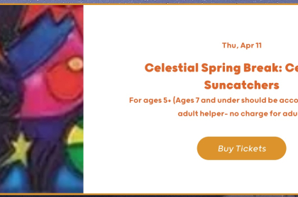 Celestial Spring Break: Celestial Suncatchers For ages 5+ (Ages 7 and under should be accompanied by an adult helper- no charge for adult) Time & Location Apr 11, 2024, 10:30 AM - 11:30 AM Saranac Lake, 62 Main St, Saranac Lake, NY 12983
