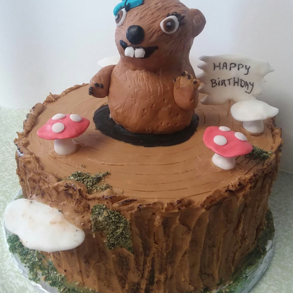A birthday cake decorated like a log with a flag